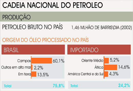 | O petróleo tem papel importante na matriz energética brasileira, com 30% da produção de energia primária. O Brasil possuí reservas de 13 bilhões de barris de petróleo. A produção offshore de petróleo é fundamental, respondendo por 80% do total produzido no país, 1 milhão de barris diários provenientes de 74 plataformas fixas e 23 flutuantes. A Bacia de Campos, no Rio de Janeiro, é a principal província petrolífera do país, produzindo mais de 80% do petróleo nacional.